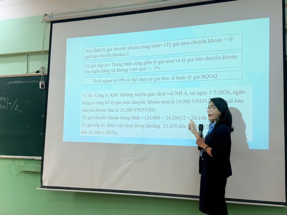 Chương trình tập huấn do TS. Cao Thị Cẩm Vân – Trưởng bộ môn Kế toán trực tiếp giảng dạy, với nội dung được xây dựng bám sát quy định của Thông tư 99/2025/TT-BTC và định hướng hội nhập quốc tế trong lĩnh vực kế toán.