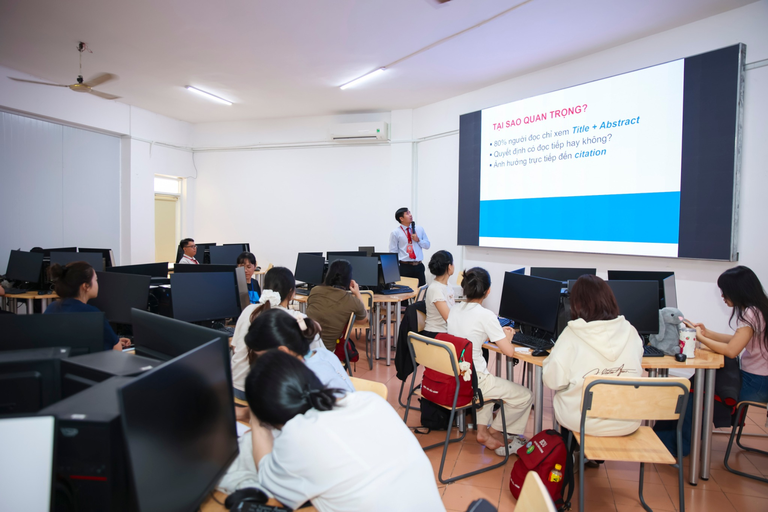 Bên cạnh đó, chương trình còn tập trung vào kỹ năng xây dựng tiêu đề bài nghiên cứu ngắn gọn, rõ ràng nhưng vẫn đảm bảo thể hiện đúng nội dung và thu hút sự chú ý. Sinh viên cũng được hướng dẫn cách lựa chọn từ khóa (keywords) phù hợp nhằm nâng cao khả năng tìm kiếm và lan tỏa giá trị của công trình nghiên cứu.